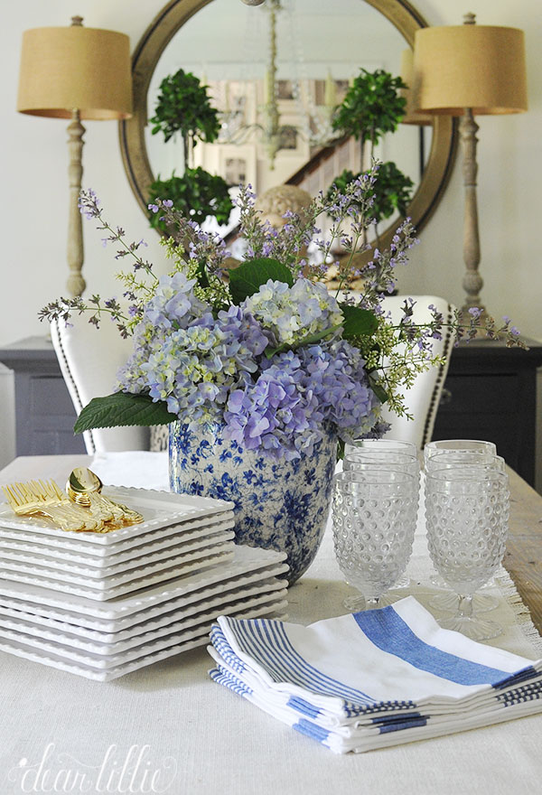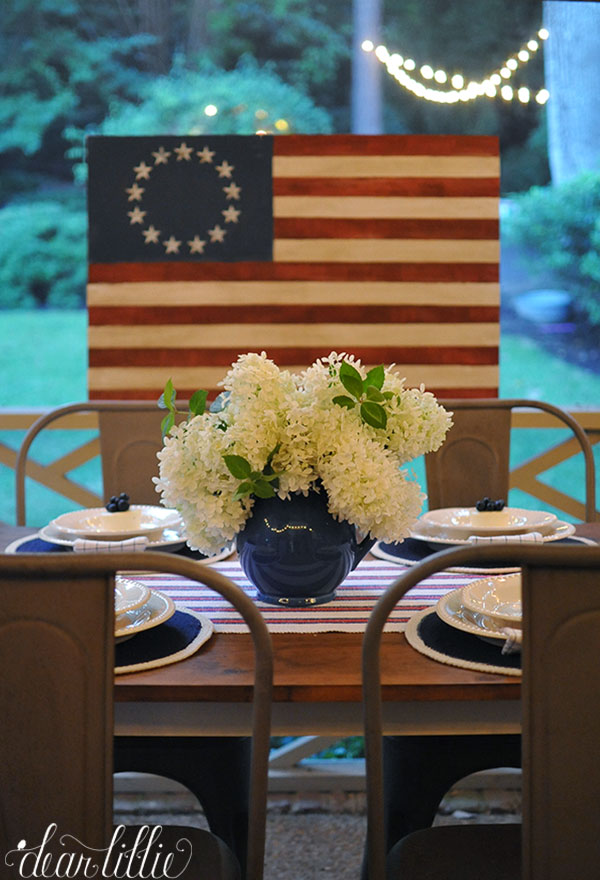 I hope you all are having a wonderful Fourth of July weekend! We just wanted to pop in with some very simple yet festive touches we added to our porch. We found this pretty blue pitcher at HomeGoods so we decided to fill it with some hydrangeas from our yard and then added a few other blue and red touches like the table linens and the flag that we painted on some wood several years ago.
