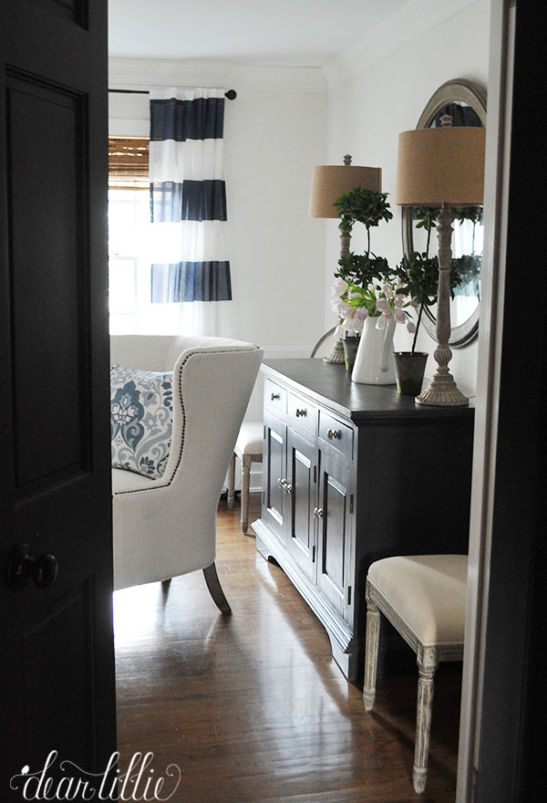 I hope you are having a wonderful weekend! Although I do think I will eventually add wallpaper in here one of my favorite things about having the walls white now is that with just a quick little switch of some pillows and curtains I can play around with different colors in here.