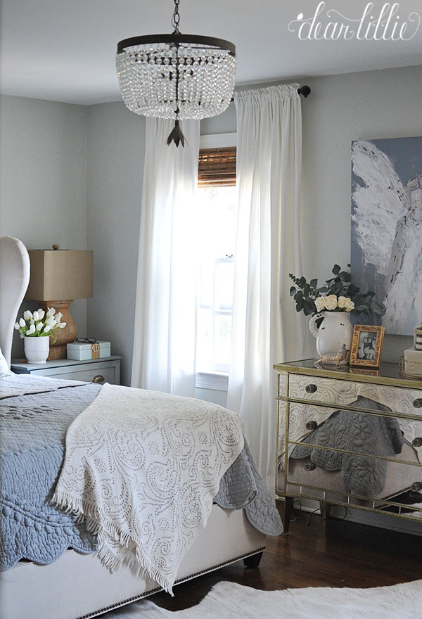 When we did the bedroom switcharoo for the girls and moved Lillie into her own room that meant this mirrored dresser had to get moved out of the guest room. We had been wanting to add a second dresser into our room since we moved in so we figured we would try it in here.