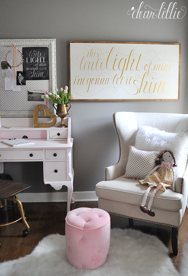 We have another new sign that we will be adding to our shop. This one is has gold writing and a warm wood frame and says “This little light of mine, I’m gonna let it shine…” We hung it in Lillie’s room originally but the proportions weren’t quite right so we actually are using it in another children’s room we are helping with but we won’t have pictures of that for a few more weeks.