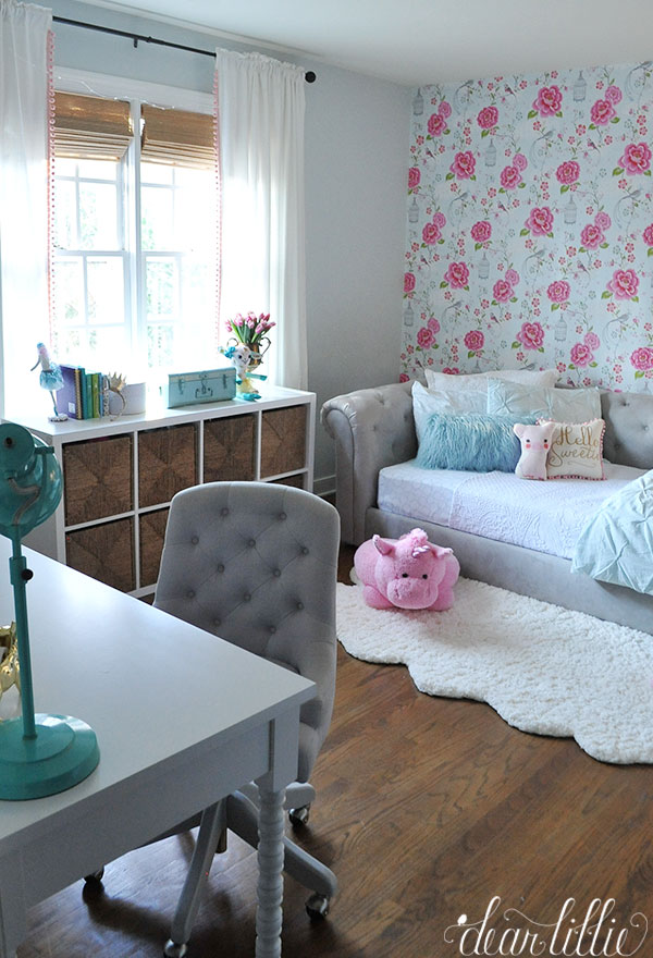Although it’s not quite finished, I thought we we share some images of Lola’s new room today. This room was a little trickier to work on than Lillie’s new room because we were torn on keeping the wallpaper and we wanted to incorporate a real regulation sized basketball hoop into her room.