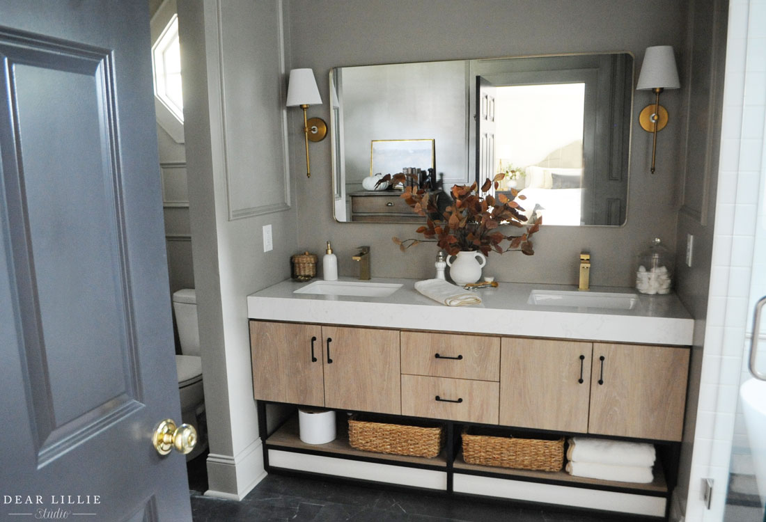 Good morning! This morning I’m back with photos of our primary bedroom and bathroom decorated for Christmas. (Sunday I shared our living room, Monday our kitchen and dining room, and yesterday our back hallway including our pantry, laundry closet and powder room if you want to see any of those posts.)