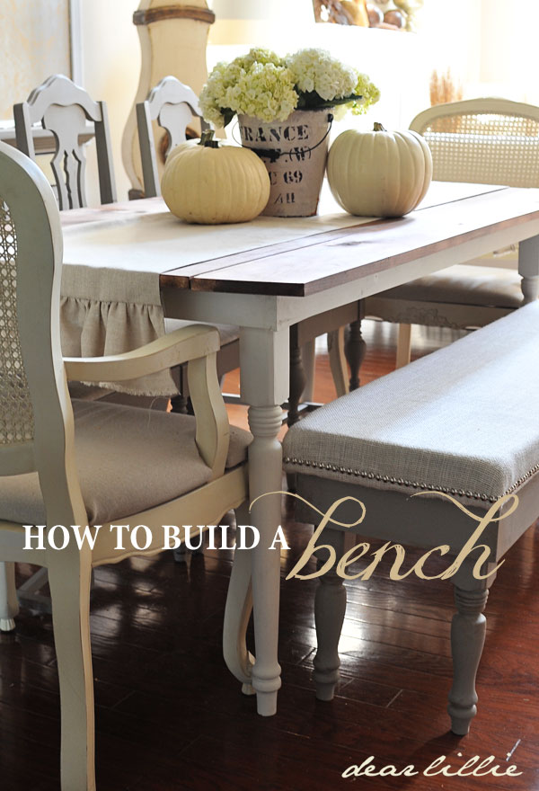 A couple of weeks ago I showed you all this bench I made for our dining room. Well, I finally got all of my photos uploaded and ready so I could show you how I made it. It was completely inspired by the farmhouse table I made a couple of weeks earlier using Miss Mustard Seed’s tutorial.